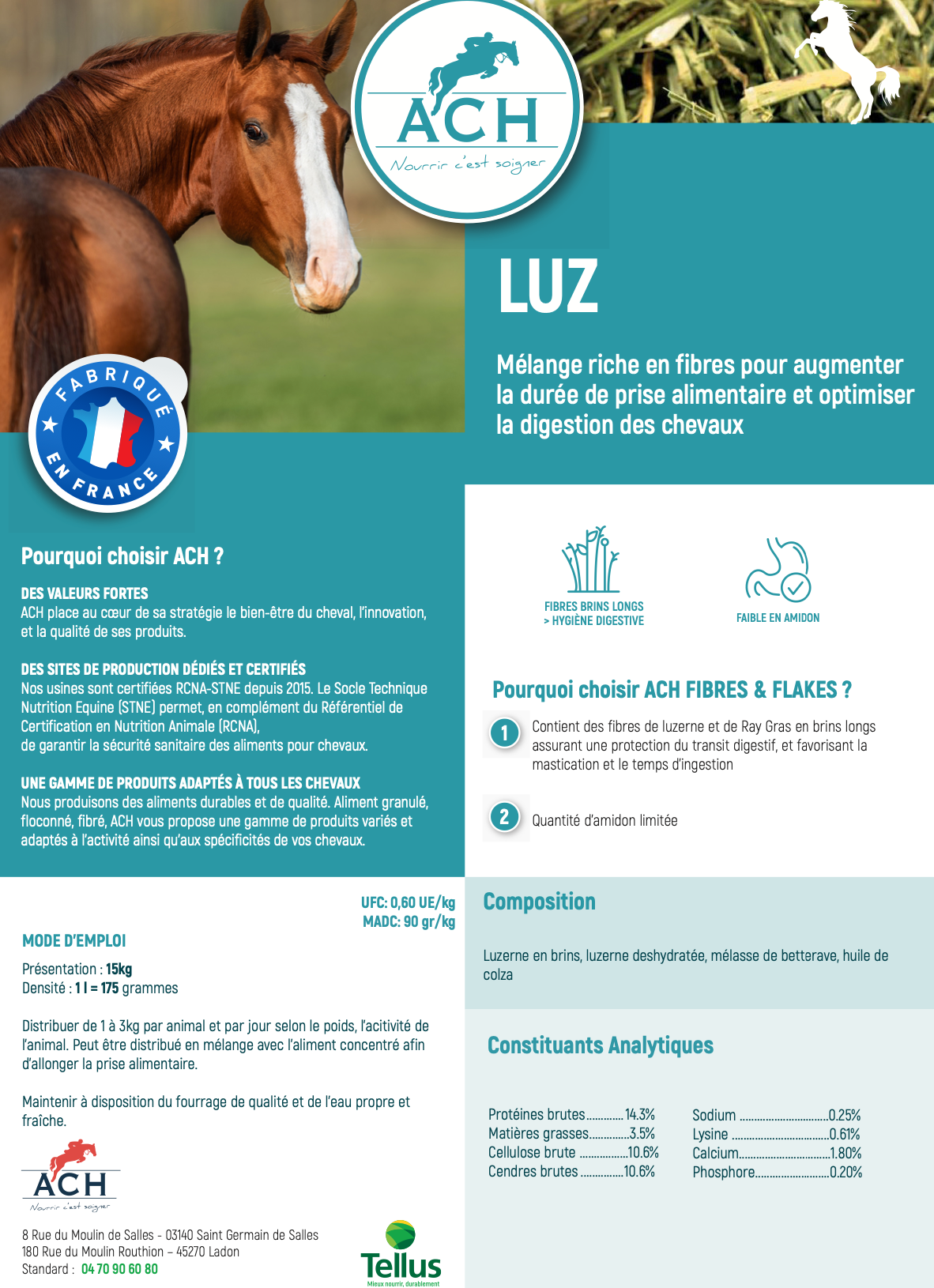 Conçu par ACH, spécialiste français de la nutrition équine, LUZ est un aliment riche en fibres longues à base de luzerne et de ray-grass.