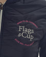 Veste à la coupe ajustée et confortable. Matelassage chevrons à l'avant. 2 poches avec fermeture à bouton pression F&C. Col, hanches et poignets côtelés. Broderie Flags&Cup sur cœur. Patch métallique sur cuir PU sur la manche droite. Tirette F&C. Rivet métallique haut du dos. Composition : 92% polyester, 8% élasthanne.