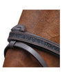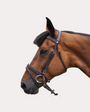 Bridon en cuir, doublé. Frontal et muserolle combinée ornés de strass noir. Passant de muserolle amovible. Bouclerie argentée. Rênes eventer.