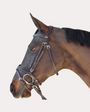 Frontal et muserolle 1/2 rond surpiqués. Têtière anatomique doublée. Bouclerie carrée laiton. Rênes caoutchouc.
