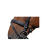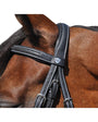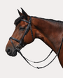 Frontal et muserolle combinée, doublés et bombés 1/2 rond cuir brillant. Têtière anatomique, doublée et estampée F&C. Bouclerie Inox gravée F&C. Livré avec rênes caoutchouc eventer.