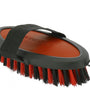 Brosse avec dos en polyuréthane effet cuir, rembourré de mousse et renforts sur les bords au toucher doux. Fibres bicolores de 3,9 cm et sangle en polypropylène.