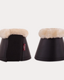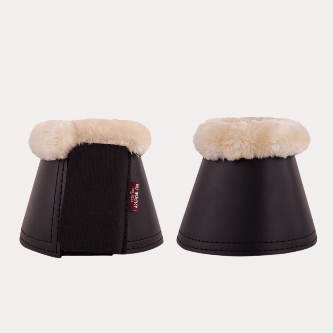 Le bord supérieur de ces cloches en cuir synthétique est doublé peau de mouton synthétique (100 % polyester) difficile à distinguer de la peau de mouton véritable. Cette imitation de peau de mouton est très douce, légère, respirante et très facile d’entretien. La fourrure synthétique est lavable en machine à 30 °C et séchable en machine. Le matériau conserve son bel aspect et ne se déforme pas. Les cloches sont dotées d’une doublure antichoc réalisée en néoprène de 5 mm d’épaisseur et d’un rabat de fermeture de sécurité par Velcro à l’arrière. Les cloches empêchent le cheval de cogner et de blesser ses propres talons ou ses glomes.