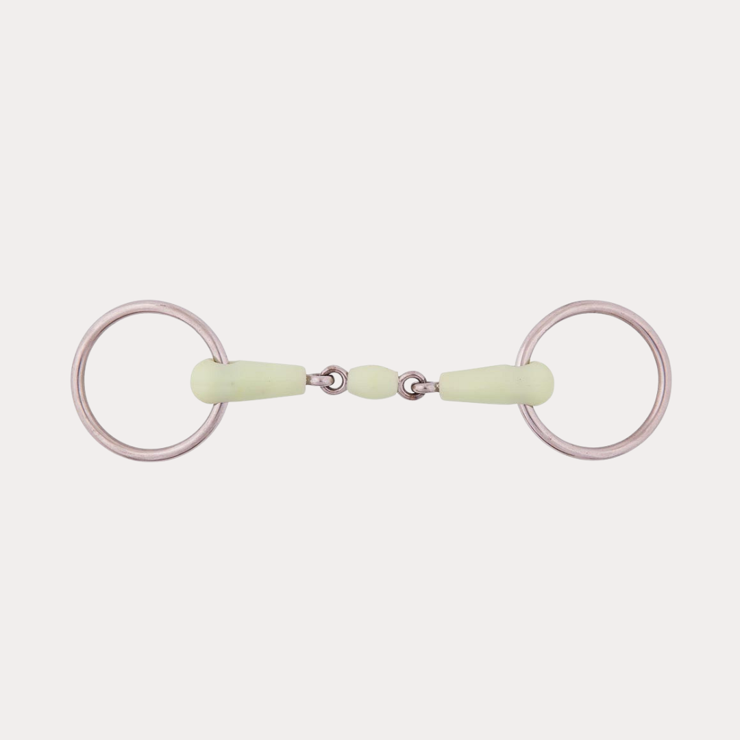 Filet à anneaux à double brisure avec une embouchure Apple Mouth et des anneaux en inox, anneaux 55 mm chez 11.5 cm et 65 mm chez 12.5 cm, 13.5 cm et 14.5 cm. Épaisseur du canon 18 mm.