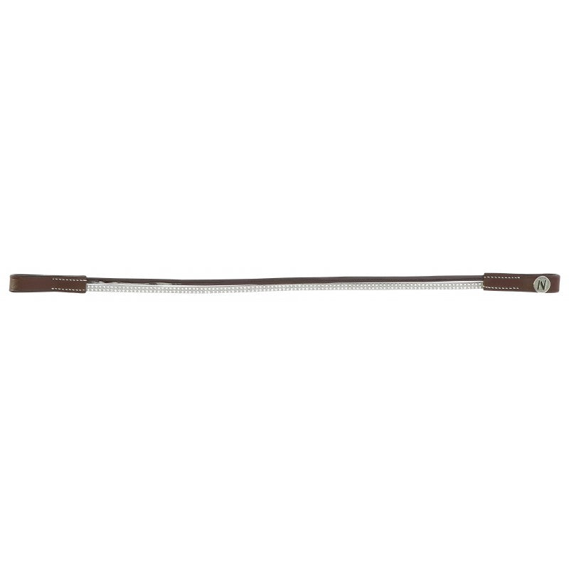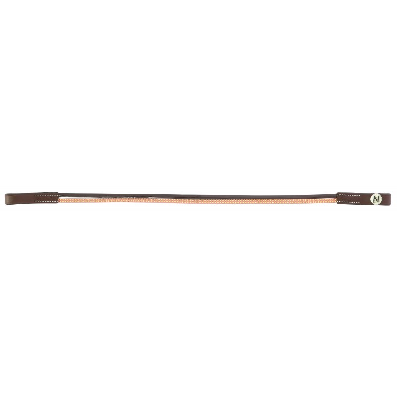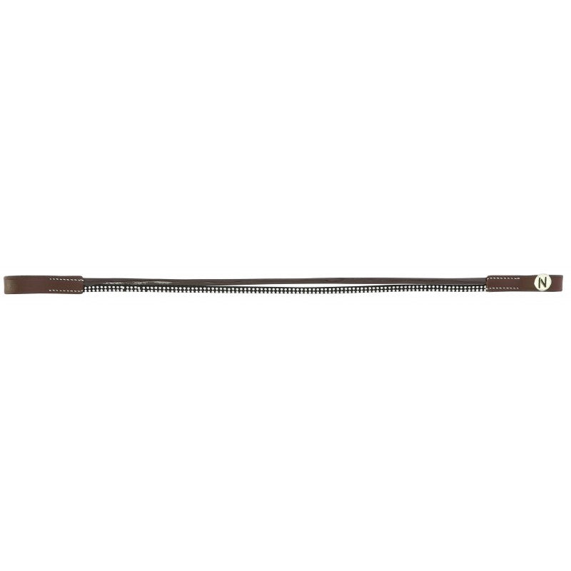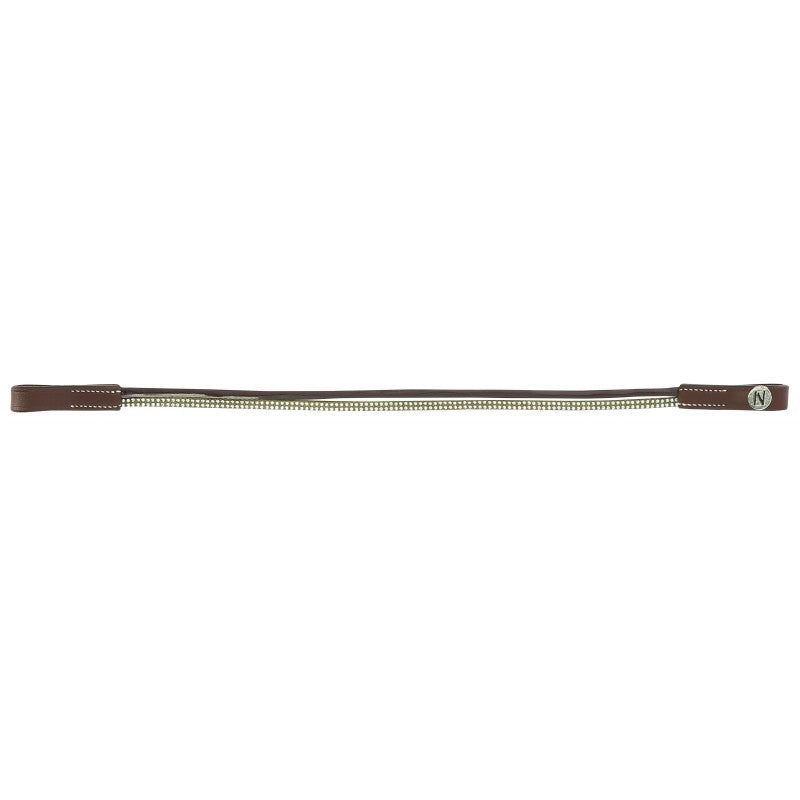 Frontal en cuir de buffle avec deux lanières : une en polyuréthane aspect cuir vernis et une en polyester ornée de petits clous brillants. Coutures blanches pour cuir havane.