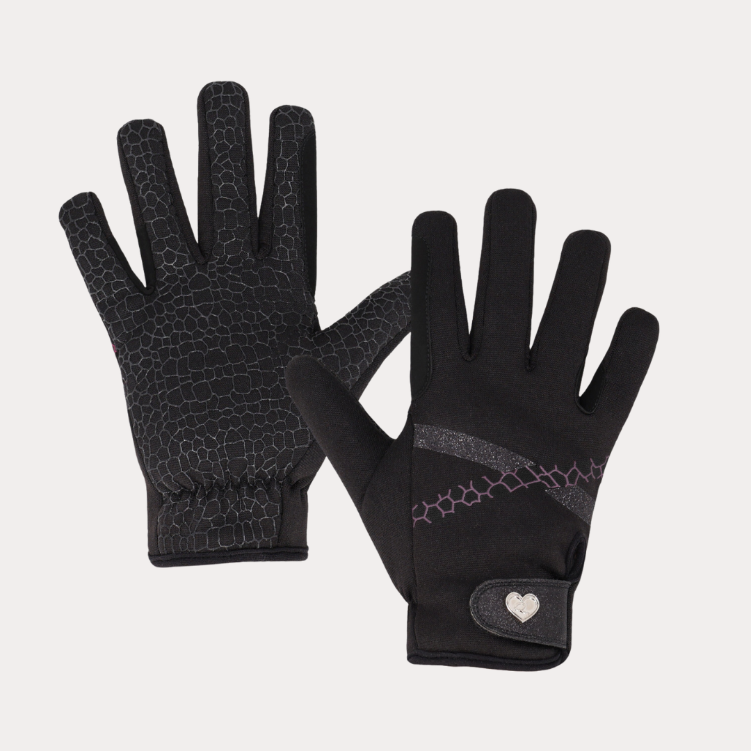 Ces gants de la collection Lize présentent une belle impression sur le dessus et offre une bonne adhérence grâce à la matière de la paume. La fermeture auto-agrippante est ornée de paillettes et d'un joli Q-pin en forme de cœur. Les gants sont renforcés entre l'annulaire et l'auriculaire, ainsi qu'entre l'index et le pouce.