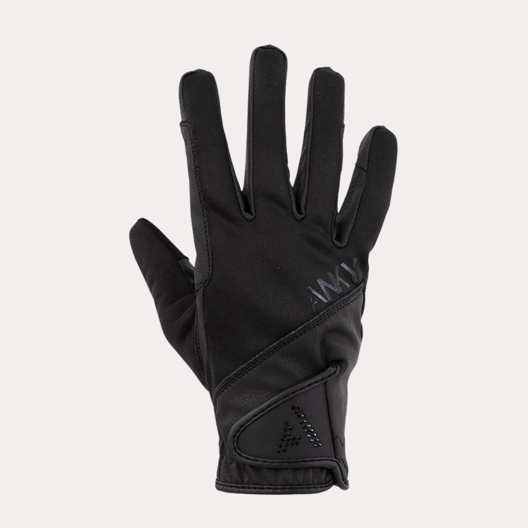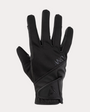 • Tissu softshell respirant, évacuant l'humidité et extensible • Matériau tactile au niveau du pouce et des doigts • Imprimé noir brillant avec logo et passepoil noir pailleté • Fermeture velcro avec logo en strass noirs • Idéal pour toutes les disciplines