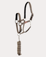 Quincaillerie : zinc, plaqué argent • Tricolore • Têtière réglable • Muserolle réglable avec doublure en nubuck • Fermeture des joues avec mousqueton • Avec longe tressée ronde assortie : 1,6 x 200 cm (l x l)