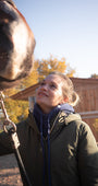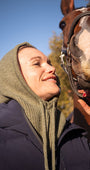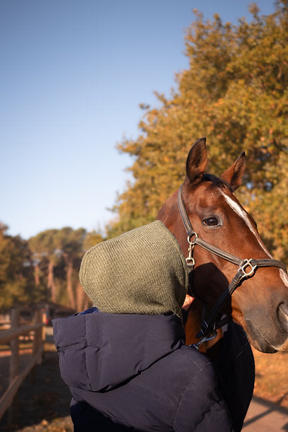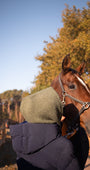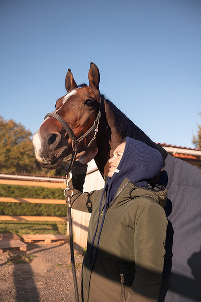 Polyvalente et intemporelle, la cagoule Michèle s’accorde avec toutes les tenues d’équitation et se porte aussi bien à cheval qu’à pied.