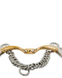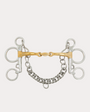 Sur un mors à anneaux double brisure le canon est en trois parties. La partie centrale du canon repose à plat sur la langue. Cela crée ainsi davantage de pression sur la langue qu’avec un mors simple brisure. Plus la partie centrale est épaisse, plus la pression sur la langue est importante.