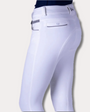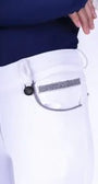 Pantalon blanc de concours fabriqué avec un tissu technique déperlant et léger. Double poche à l’avant ornée d’une bande brillante argentée sur la poche intérieure et souligné avec une bande grise sur la poche extérieure. Deux fausses poches derrière décorées avec un bouton et souligné avec une bande grise. Silicone ‘grip’ au genou. Bas de jambe en lycra.