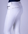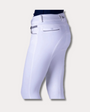 Pantalon blanc de concours fabriqué avec un tissu technique déperlant et léger. Double poche à l’avant ornée d’une bande brillante argentée sur la poche intérieure et souligné avec une bande grise sur la poche extérieure. Deux fausses poches derrière décorées avec un bouton et souligné avec une bande grise. Silicone ‘grip’ au genou. Bas de jambe en lycra.
