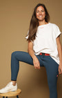 Pastille corail fluo sur la cuisse, logo GEM sur le passant arrière de la ceinture, les détails le subliment.