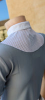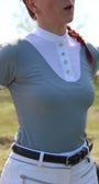 Polo de concours ‘Isabella’, vert- gris fabriqué avec deux matières techniques extensibles qui évacuent la transpiration et qui donne une liberté de mouvement totale. Le tissu ‘nid d’abeille’ utilisé pour le décolleté et le haut du dos est léger mais non-transparent. C’est ce qui est visible sous la veste de concours et ce qui donne à ce polo une élégance et un confort hors norme. Se lave en machine à 30°.