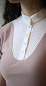 Polo de concours ‘Isabella’, fabriqué avec deux matières techniques extensibles qui évacuent la transpiration et qui donne une liberté de mouvement totale. Le tissu ‘nid d’abeille’ utilisé pour le décolleté et le haut du dos est léger mais non-transparent. C’est ce qui est visible sous la veste de concours et ce qui donne à ce polo une élégance et un confort hors norme. Se lave en machine à 30°.