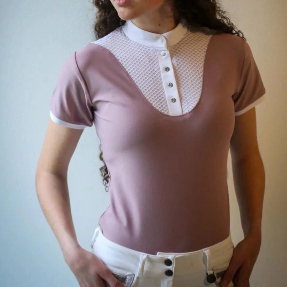Polo de concours ‘Isabella’, fabriqué avec deux matières techniques extensibles qui évacuent la transpiration et qui donne une liberté de mouvement totale. Le tissu ‘nid d’abeille’ utilisé pour le décolleté et le haut du dos est léger mais non-transparent. C’est ce qui est visible sous la veste de concours et ce qui donne à ce polo une élégance et un confort hors norme. Se lave en machine à 30°.