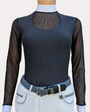 Polo de concours fabriqué avec une matière ‘stretch’ et technique pour un confort optimal à cheval. Manches longues et empiècement du décolleté en voile élastique, légère et résistante, décorée sur l’empiècement du décolleté avec des lignes de strass ‘Aurore Boréalis’ (qui reflète la lumière en multi couleurs). Le col est brodé avec le petit logo ‘ShowRiders’ avec une strass a chaque bout.