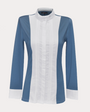 Polo d’équitation femme bi-matière, alliez l’élégance et le confort pour vos concours. L’élégance d’une chemise de concours raffinée avec son plastron plissé intégral. Le confort d’un polo technique souple, léger, confortable et respirant. Patte de boutonnière boutons cachés. Poignets chemise. Broderie F&C argentée sur le col (à fermeture magnétique). Composition : plastron : 60% coton, 38% polyamide, 2% popline élastique. corps : 95% polyester, 5% jersey élastique.