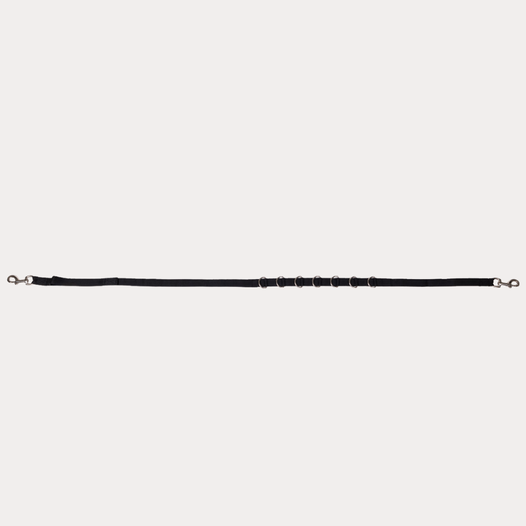 Pendant le longe, les rênes fixes sont utilisées pour apprendre au cheval à entrer en contact avec le mors. Elle peuvent être utilisées pour une position basse, horizontale ou haute de la tête. La rêne comporte 6 anneaux en D pour changer rapidement la longueur de la rêne, ce qui la rend très facile à utiliser. L'insert élastique assure le confort du cheval.