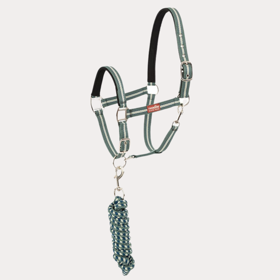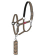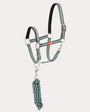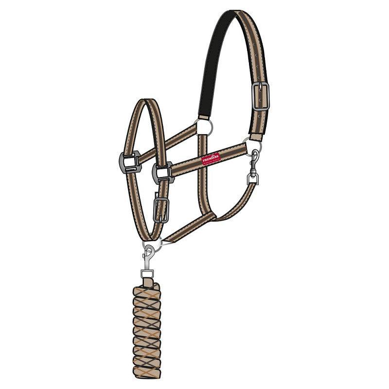 Matière : fil de polyuréthane Doublure : nubuck souple (têtière et muserolle) Ferrure : zinc chromé • Tricolore • Têtière réglable • Muserolle réglable • Avec longe tressée ronde assortie : 1,6 x 200 cm (l x L)