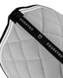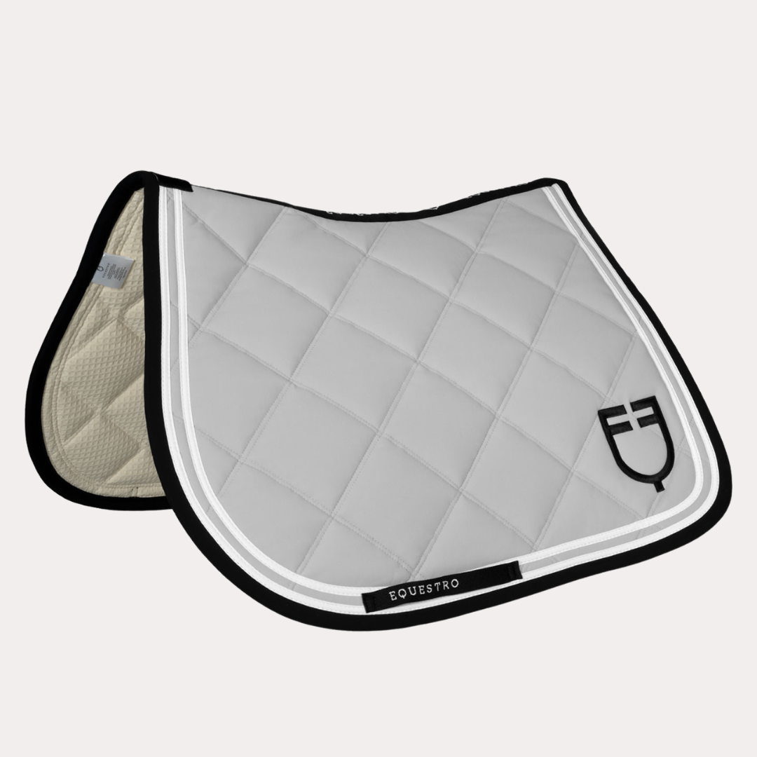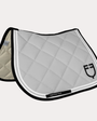 Tapis de selle de saut en tissu technique avec matelassage à losanges et décoration avec double bande le long des bords. Équilibre idéal entre résistance, respirabilité et style.
