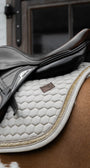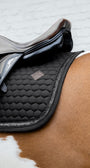 Avec sa bande pailletée éclatante, le tapis de selle à bande pailletée au style unique apporte une touche d'élégance à votre cheval. Son design exclusif attire tous les regards, que ce soit à l'entraînement ou en compétition. De plus, il offre un large espace pour une broderie personnalisée, vous permettant d'ajouter votre touche personnelle.