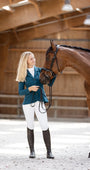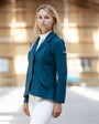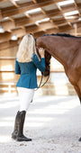 La coupe est cintrée et la veste est dotée de deux vraies poches dont les rabats sont ornées de deux rangée de strass. La veste se ferme avec une fermeture éclaire et 4 boutons avec strass de couleur au milieu.
