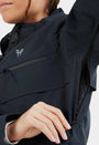 Elle dispose de toutes les caractéristiques techniques pour la pratique de l’équitation : une capuche qui s’attache, cinq poches extérieures, des ouvertures d’aération pour faire circuler l’air. Le bas du zip est raccourci pour ne pas frotter contre la selle. Le volume de la veste s'adapte grâce à des ouvertures sur le côté.